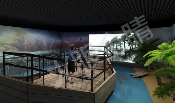 沉浸式暴風(fēng)雨體驗根據(jù)臺風(fēng)現(xiàn)象,采用先進(jìn)的多媒體和實景結(jié)合技術(shù),模擬臺風(fēng)登陸城市的景象,在真實的空間里模擬12級臺風(fēng),使體驗者有身臨其境的感覺。臺風(fēng)體驗項目體驗者穿上雨衣進(jìn)入體驗區(qū)域,強(qiáng)風(fēng)機(jī)和噴水機(jī)制造強(qiáng)風(fēng)和水珠特效,投影畫面與臺風(fēng)實時同步,用視頻表現(xiàn)臺風(fēng)天氣城市的狀態(tài),震撼的音響效果,實景式的視覺、聽覺、觸覺使體驗者得到全方位的感受。通過體驗臺風(fēng)降臨,普及臺風(fēng)知識,提高自我保護(hù)意識。