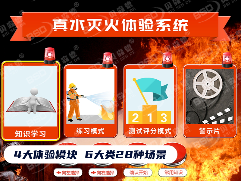 模擬真水滅火體驗系統(tǒng)是一套軟硬件結合的互動體驗教學系統(tǒng),主要用于單人滅火實訓。軟件采用3D建模還原火災場景,使用真水作為滅火劑,體驗者使用滅火器、水槍或者其他滅火設備向場景中的的大火噴水,感應設備會根據(jù)體驗者噴射的位置以及持續(xù)時間來確定撲救是否有效,從而有效的控制火勢大小,模擬滅火的過程。